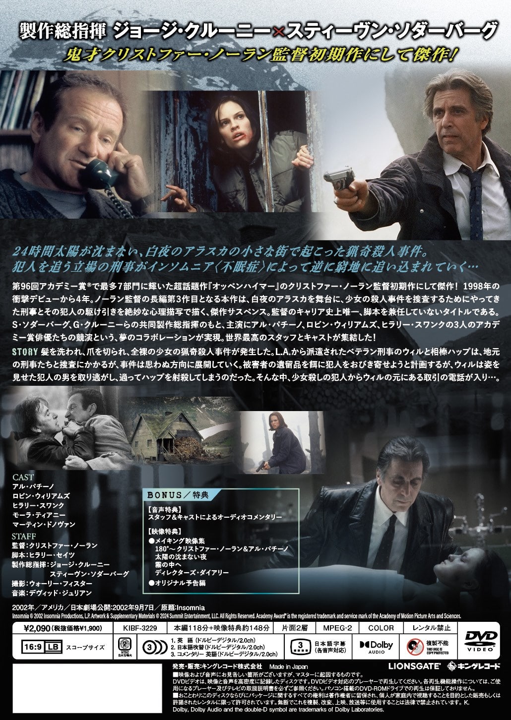 アル・パチーノ、ロビン・ウィリアムズ、ヒラリー・スワンク、モーラ・ティアニー、マーティン・ドノヴァン Insomnia © 2002 Insomnia Productions, L.P. Artwork & Supplementary Materials © 2024 Summit Entertainment, LLC. All Rights Reserved. Academy Award® is the registered trademark and service mark of the Academy of Motion Picture Arts and Sciences.