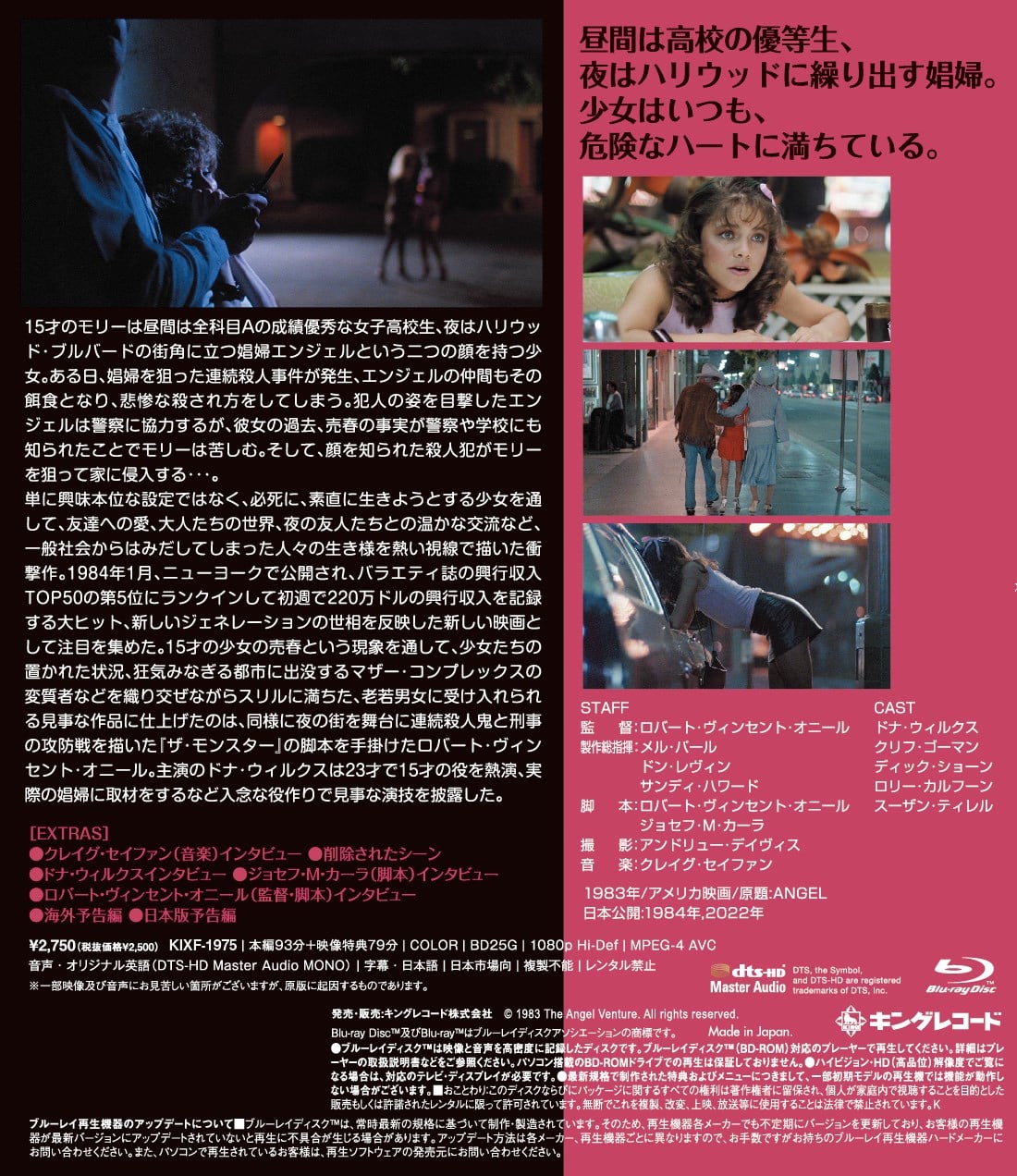 全米で衝撃の大ヒット!昼間は高校の優等生、夜はハリウッド・ブルバードの街角に立つ娼婦エンジェルという二つの顔を持つ少女を通して、一般社会からはみだしてしまった人々の生き様を熱い視線で描いた衝撃作。 1983年/アメリカ